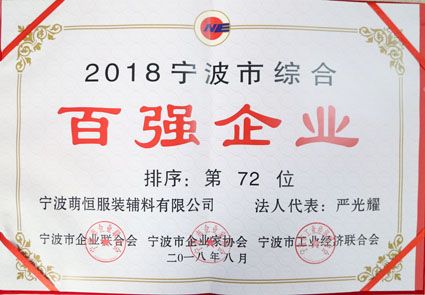 8月9日,寧波市企業聯合會、企業家協會、工業經濟聯合會發布了2018寧波企業百強榜,包括1份主榜單——“2018寧波市綜合百強企業”,3份分榜單——制造業百強企業、服務業百強企業、寧波·競爭力百強企業。 榜單是根據2017年銷售(營業)收入大小為序進行排名的。萌恒服裝輔料以369391萬元的營業收入位居2018寧波市綜合百強企業第72位,較去年排名提升14位;位居制造業百強企業第38位,較去年排名提升8位。萌恒工貿位居寧波·競爭力百強企業排名第73位。 榮登百強企業榜單,既是對萌恒過去一年發展的肯定,同時也是鞭策和鼓勵。萌恒將不忘初心,以行動踐行使命,用實干托起夢想,在自身發展壯大的同時,為社會經濟發展做出更多貢獻。