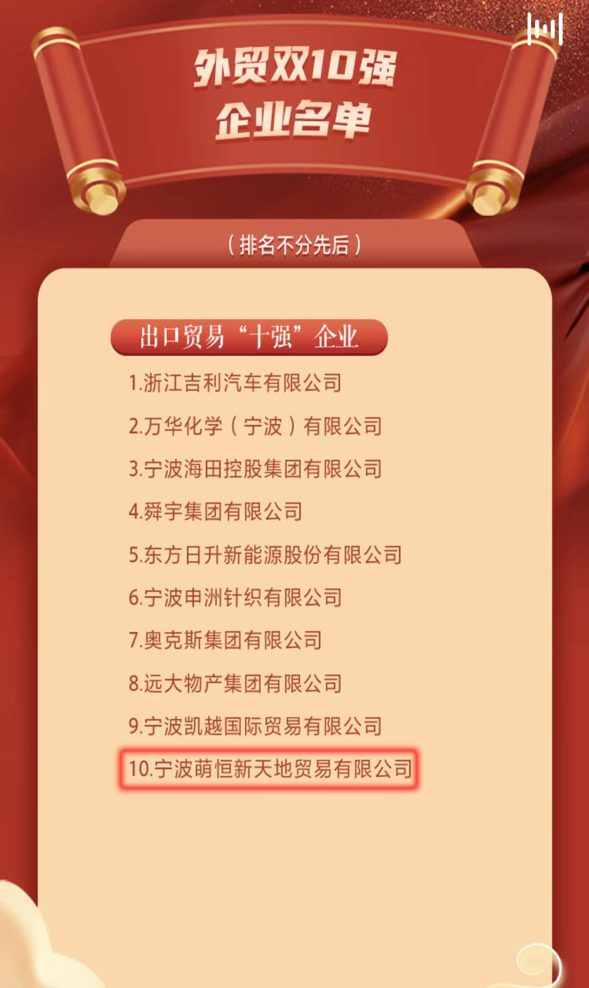 7月14日上午,被譽為“寧波經(jīng)濟奧斯卡”的2022寧波創(chuàng)新創(chuàng)業(yè)風云榜再次揭開帷幕。寧波萌恒新天地貿易限公司憑借強大的綜合實力、長足的提升能力和不竭的發(fā)展動力榮獲開放提升類外貿雙10強企業(yè)中的出口貿易“十強”企業(yè)!