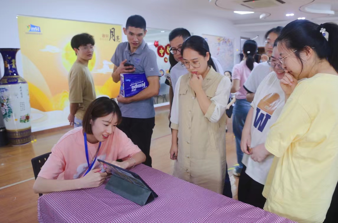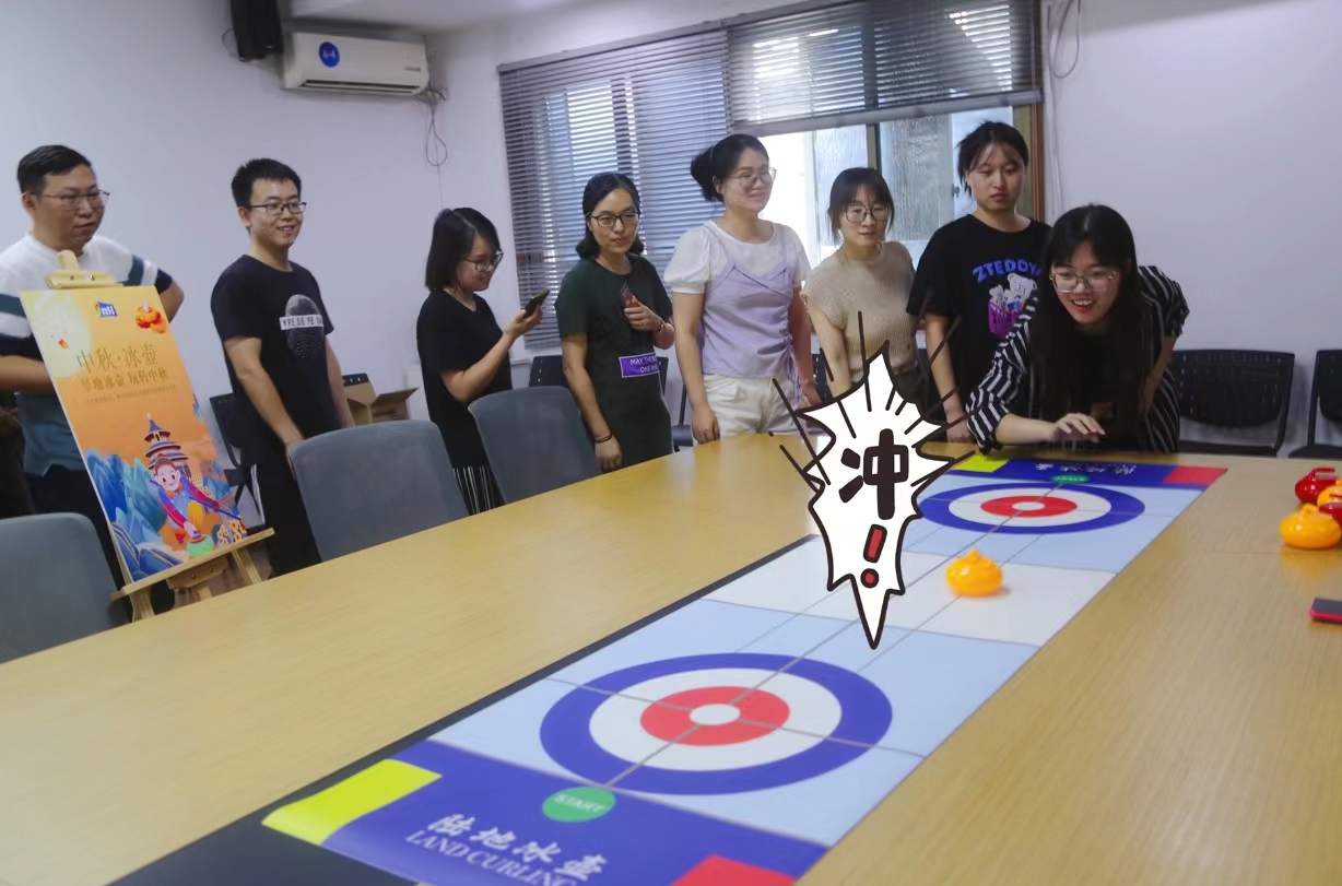 中午12點(diǎn),國貿(mào)六樓活動區(qū)人頭攢動,大家興致勃勃地前來打卡中秋游園會,感受濃郁的節(jié)日氣氛。現(xiàn)場共有5個項目,分別是團(tuán)圓中秋、旱地冰壺、巧猜燈謎、趣射月亮和詩意中秋,成功過關(guān)其中兩項,即可獲得博餅一次。對此,大家都躊躇滿志,躍躍欲試。第一項是團(tuán)圓中秋。站在精美的中秋背景板前,大家紛紛拿出手機(jī)自拍或他拍,然后分享到微信朋友圈,向親朋好友傳遞快樂。第二項是旱地冰壺。握住冰壺,用巧勁輕輕一推,沒輪到的人的心情也隨著冰壺的移動上下起伏。哇,冰壺不偏不倚正中紅心,周圍一片歡呼!第三項是巧猜燈謎。緊鎖眉頭,絞盡腦汁,猜燈謎的小伙伴們都陷入了沉思,反復(fù)思索后,說出答案,回答正確。第四項是趣射月亮。箭在弦上不得不發(fā),調(diào)整站姿,把握力道,一松手,啪的一聲,命中月亮。最后一項是詩意中秋。“海上生明月,天涯共此時”“但愿人長久,千里共嬋娟”“舉頭望明月,低頭思故鄉(xiāng)”……書寫著中秋詩句,感受著細(xì)膩鄉(xiāng)思,更感念團(tuán)圓的美好。