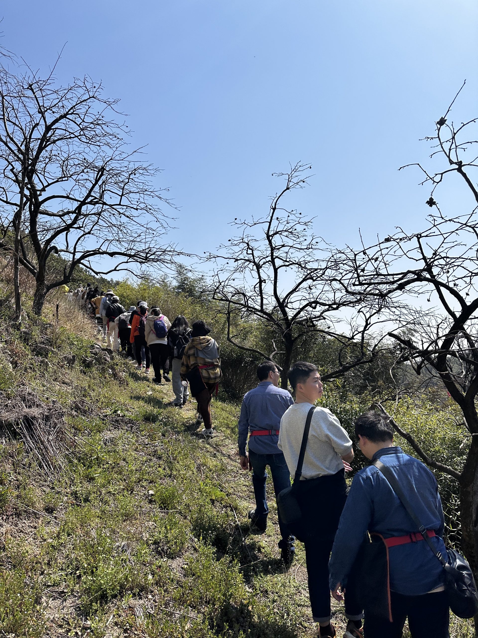 活動伊始,大家齊聚在山腳下,眼前的小山坡雖不巍峨,卻滿是蓬勃的春之氣息。眾人結伴,向著坡頂進發。一路上,歡聲笑語交織,大家一邊攀登,一邊欣賞著沿途的美景,嫩綠的新芽從樹枝間探出腦袋,不知名的野花肆意綻放,星星點點地散布在草叢中,為大地織就了一幅五彩斑斕的錦緞。
