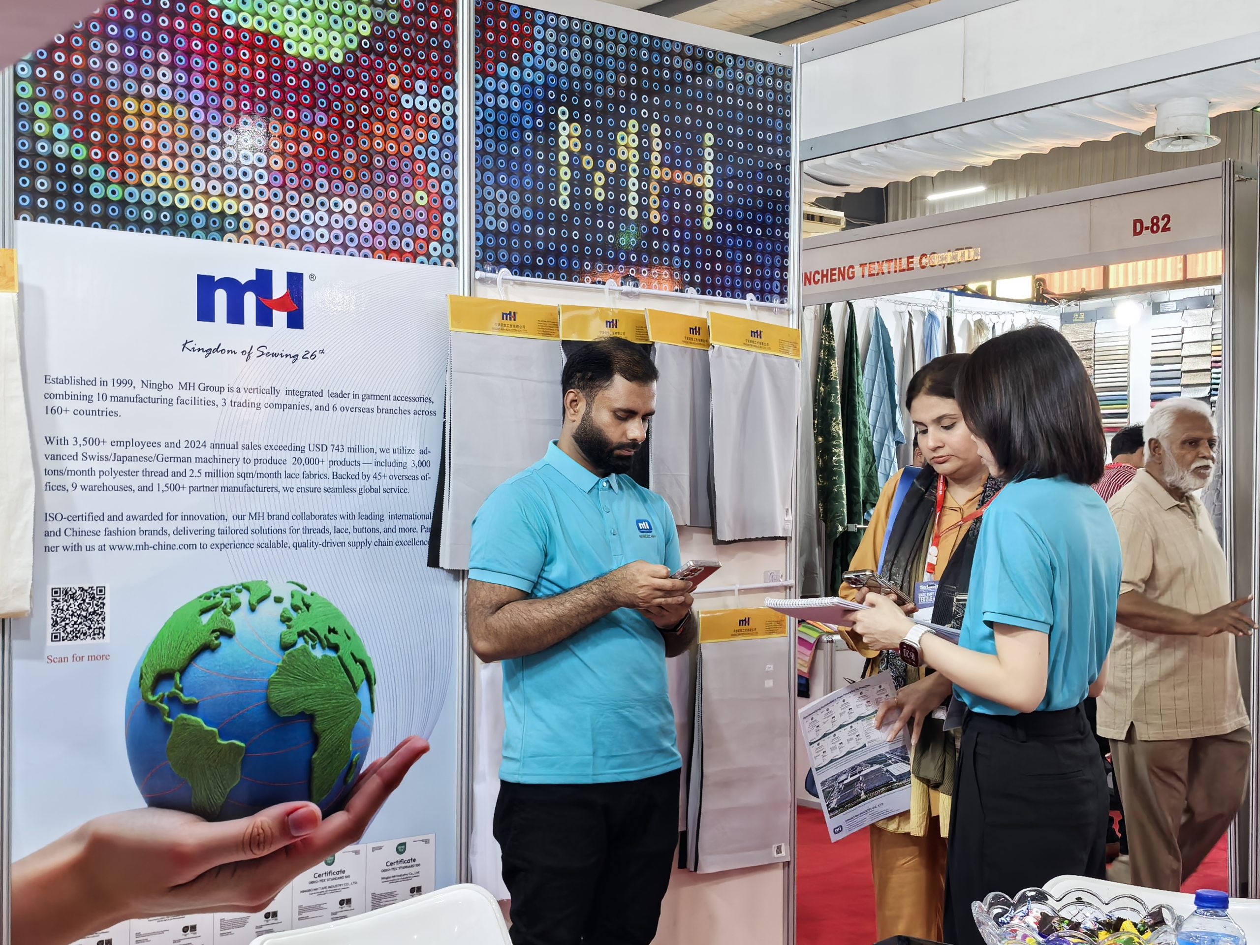 CFT ASIA展會由信德省政府、卡拉奇市及巴基斯坦各大紡織行業協會聯合支持,涵蓋紡織機械、面料及輔料等領域,是當地紡織行業的風向標。本次展會中,我們在展位選擇、樣品展示、視覺設計和客戶接待等方面做了充分準備。展位位于四號廳主通道旁,雙入口設計帶來持續人流量;精選符合市場現狀和目標產品的樣品,搭配極具記憶點的宣傳冊和在線價格表,客戶掃碼即可查看詳細報價,大大提升了溝通效率和專業性;展位采用AI設計的環保主題視覺方案,搭配統一著裝,在眾多參展商中脫穎而出,塑造了專業的品牌形象。