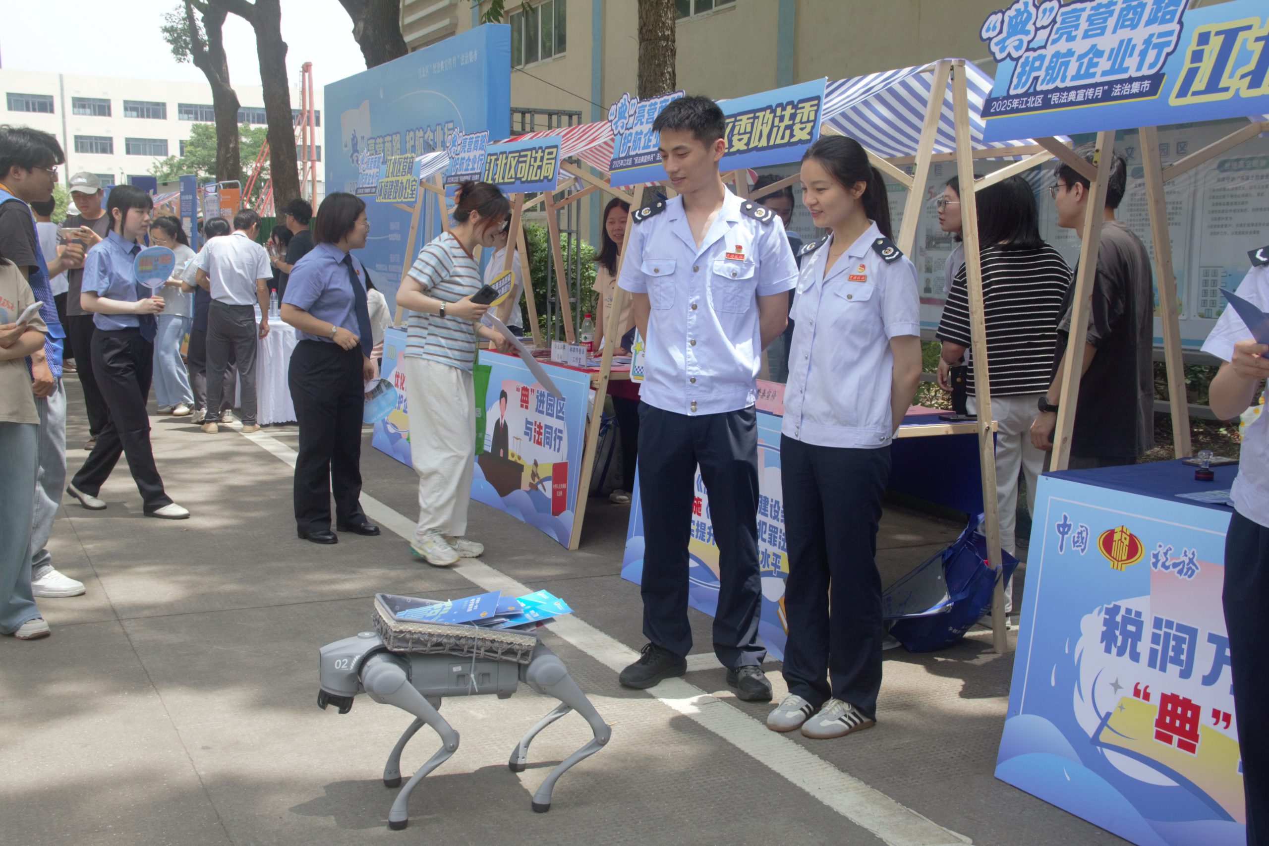 時近中午,樹蔭下的法治集市數余個特色攤位沿園區主干道兩側排開。來自交通技工學校帶來的智能機器狗更成為全場的“明星”。它不僅外形萌趣可愛,還馱著一摞精美的法治宣傳手冊,仿佛一位小小的“普法使者”,時而靜坐招手賣萌,時而靈活穿梭人群,引得來往職工紛紛駐足互動,加入法治游戲中。