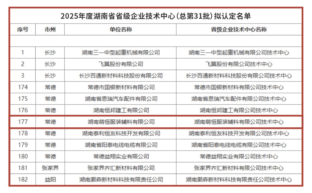 1月23日,經(jīng)湖南省工業(yè)和信息化廳公示,湖南萌恒被成功認(rèn)定為“2025年度湖南省省級(jí)企業(yè)技術(shù)中心(總第31批)”。這是繼公司獲評(píng)國(guó)家印染規(guī)范條件《2023版》全國(guó)第一批規(guī)范企業(yè)、國(guó)家紡織產(chǎn)品開(kāi)發(fā)基地、國(guó)家高新技術(shù)企業(yè)、湖南省先進(jìn)級(jí)智能工廠制造企業(yè)等多項(xiàng)榮譽(yù)后,在科技創(chuàng)新平臺(tái)建設(shè)領(lǐng)域取得的又一重大突破,標(biāo)志著公司的研發(fā)體系、創(chuàng)新能力和行業(yè)地位獲得了省級(jí)權(quán)威部門的高度認(rèn)可。