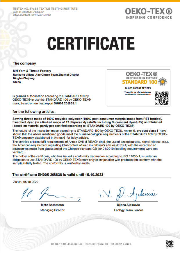 近日,萌恒線業生產的再生滌綸縫紉線順利通過生態紡織品標準100(OEKO-TEX? Standard 100)認證。Oeko-Tex? Standard 100標準是目前全球紡織領域影響力最廣的獨立測試和認證體系之一,對紡織品中含有的有害物質具有嚴格的限定,此次認證的通過充分驗證了再生滌綸縫紉線的高品質與安全性。 近年來,國際市場對紡織品在不斷滿足消費者對健康無害性的基礎上,大力推動紡織品的循環利用,建立基于廢舊紡織品循環再利用體系,不僅可以減少資源浪費,而且會大大減輕對環境造成的負擔,引導消費者踐行低碳和節儉的生活方式,對于發展循環經濟、推動綠色可持續發展具有重要意義。 ...
