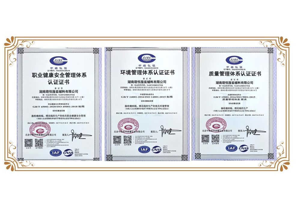 3月11日,湖南萌恒順利通過北京中經科環質量認證有限公司組織的ISO9001質量管理、ISO14001環境管理、ISO45001職業健康安全管理體系聯合審核。其中,輔料工廠順利通過三大體系復審;華繡工廠通過ISO9001質量管理體系和ISO45001職業健康安全管理體系的復審;菲克絲工廠首次通過上述兩個體系的認證審核。這標志著湖南萌恒在質量、環保、安全領域邁上了規范化、系統化的新臺階。